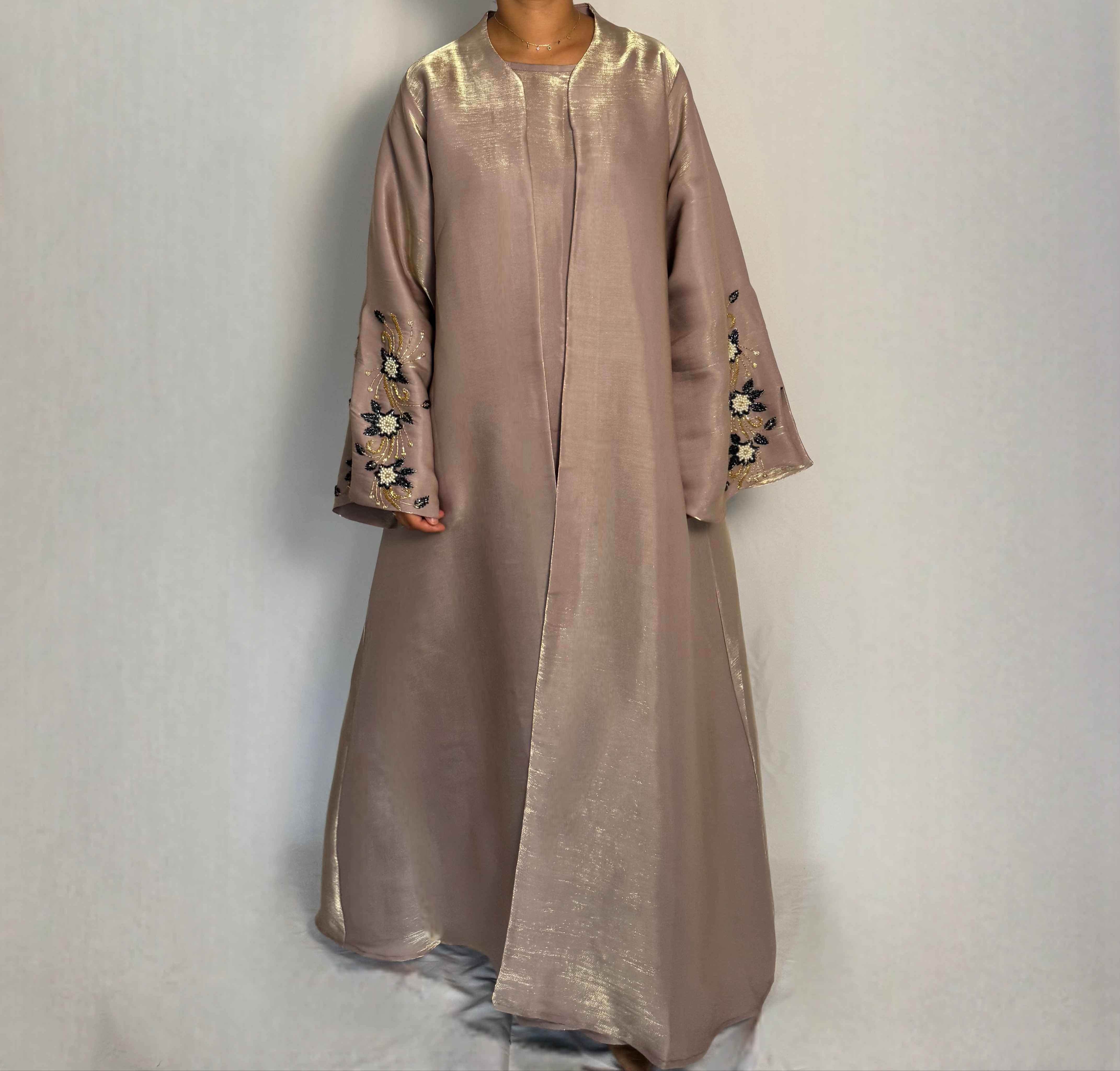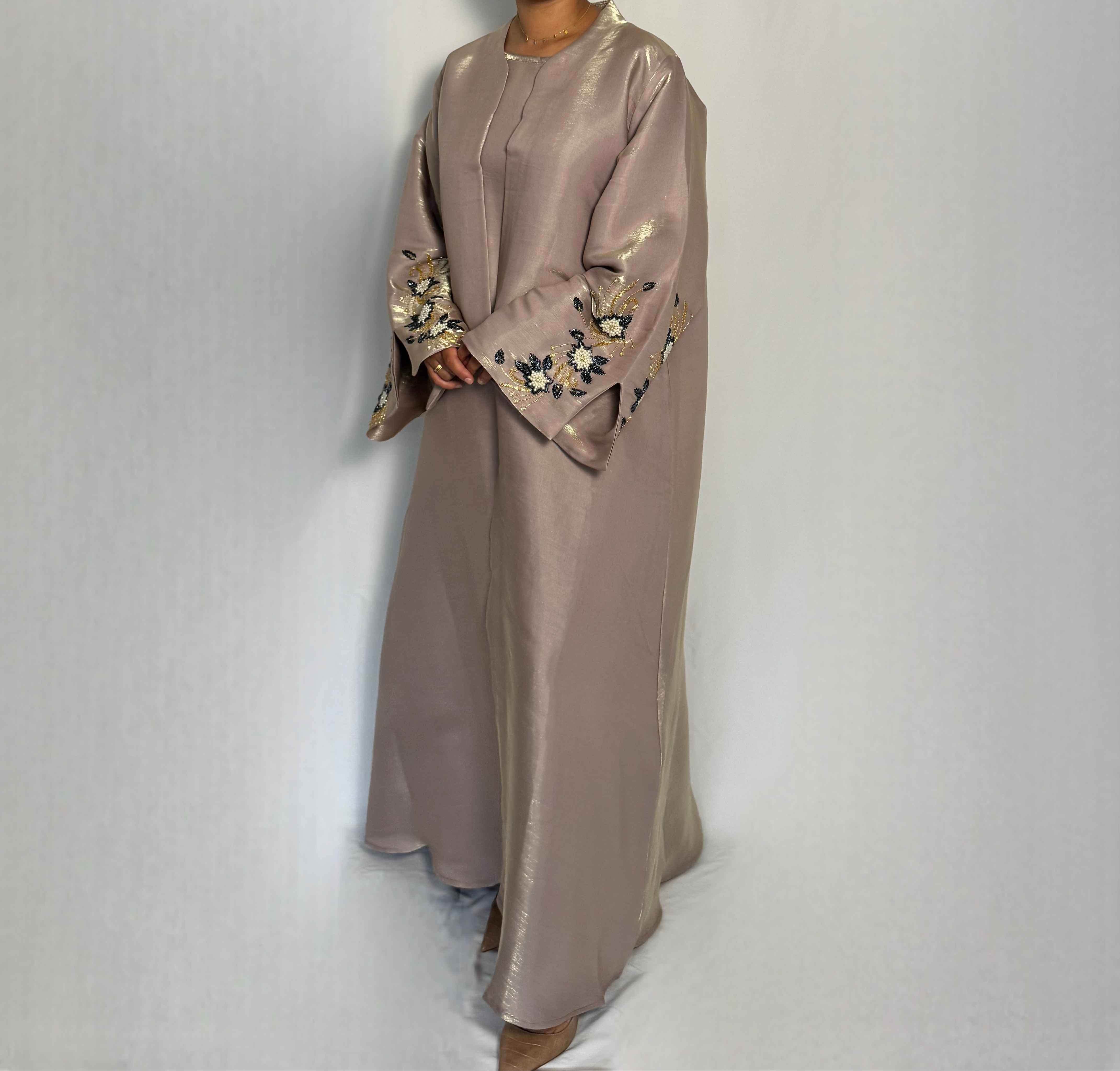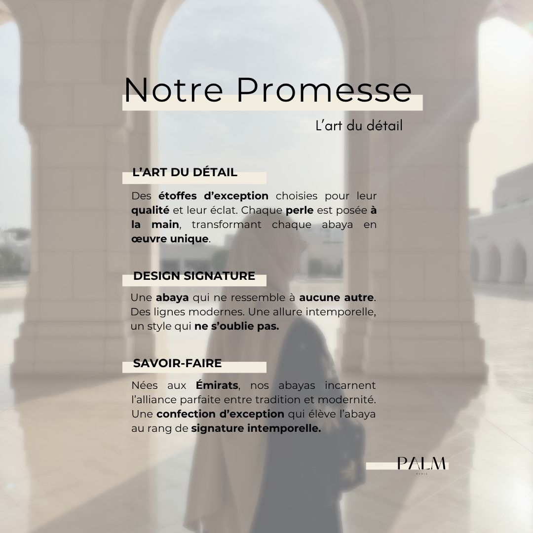 Soyeuse et scintillante, l’abaya Nour est une véritable ode à la lumière. Son tissu shimmer irisé capte chaque rayon et révèle de subtils reflets beiges à chacun de vos mouvements — comme un lever de soleil qui caresse la peau.