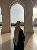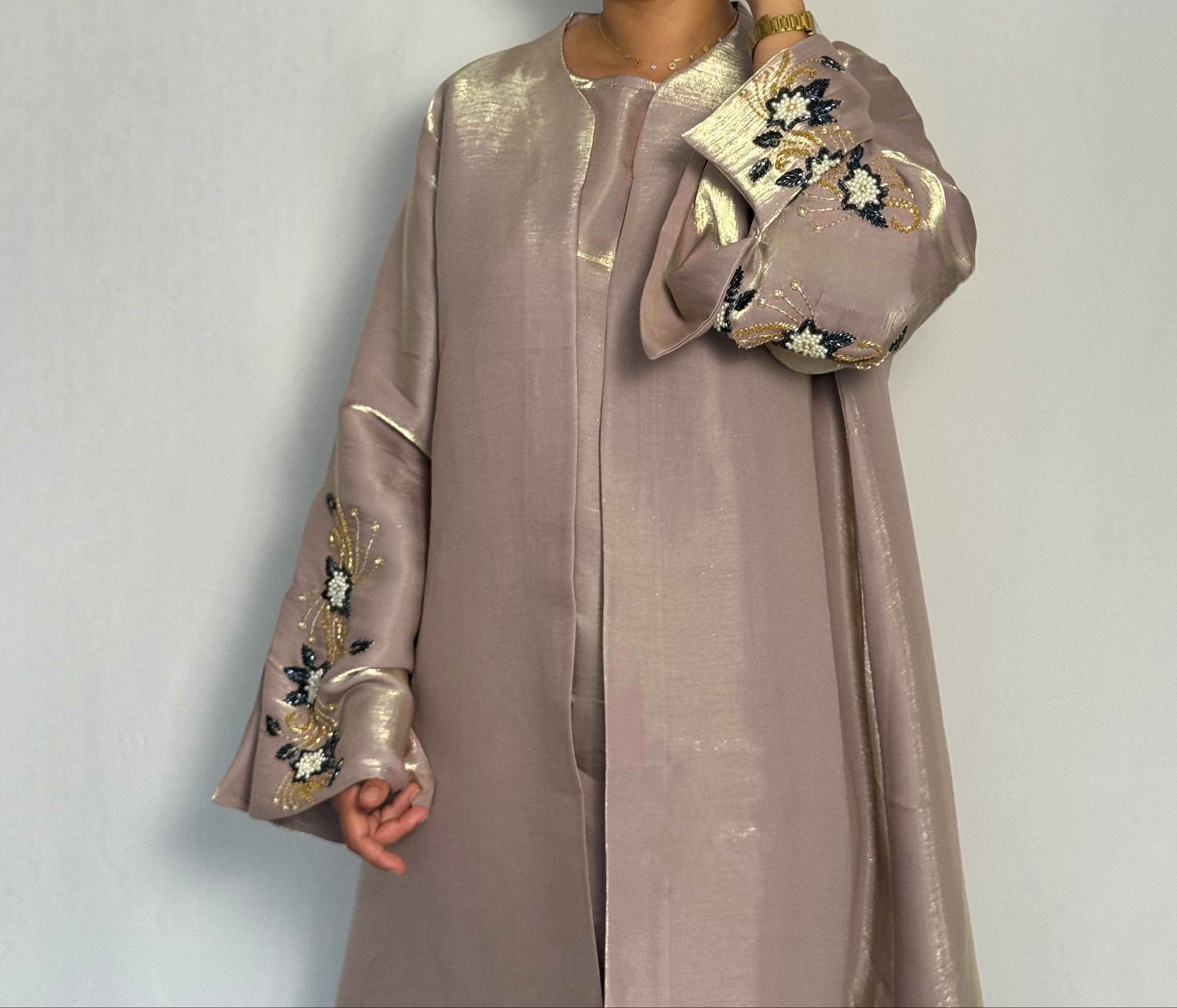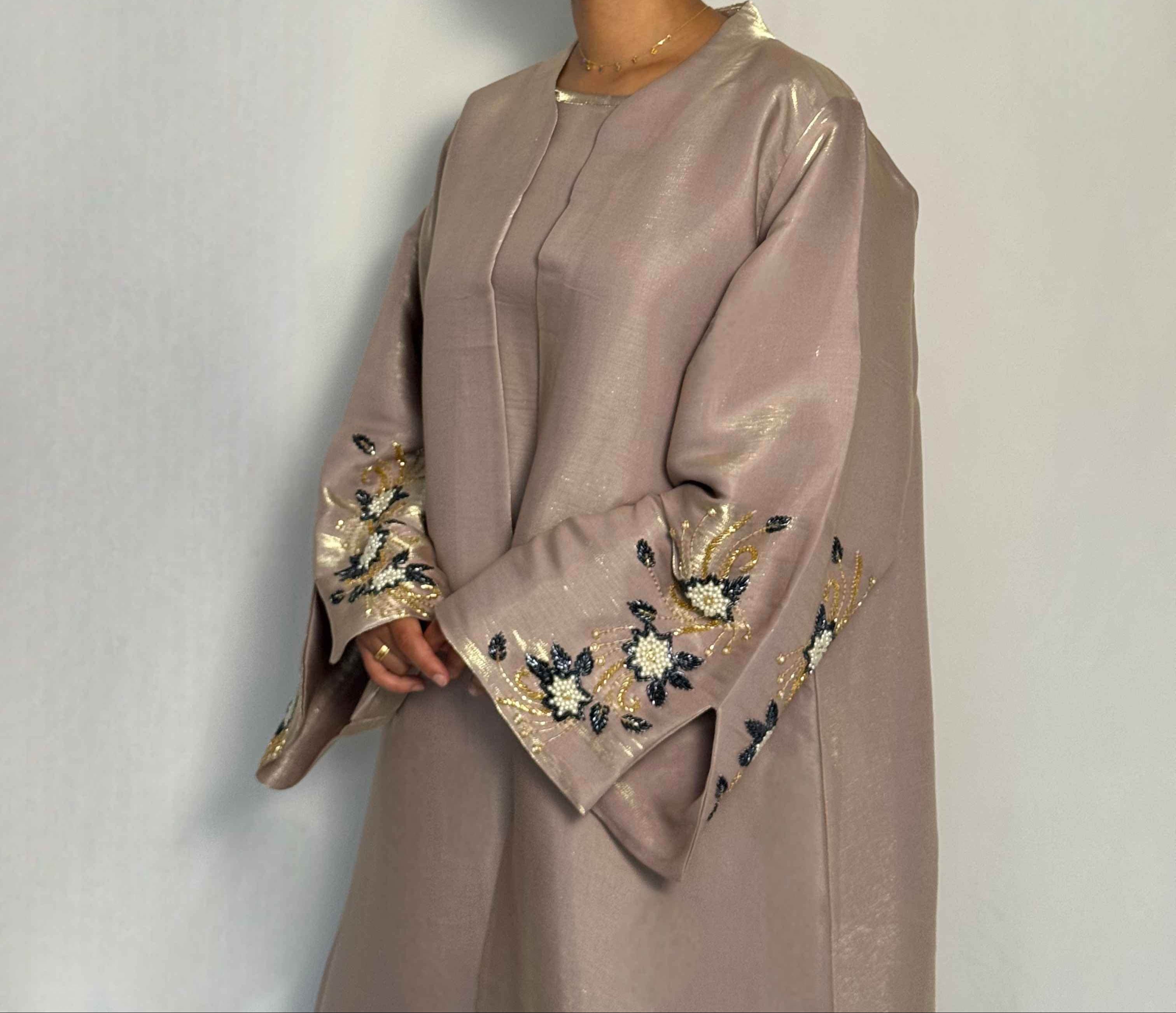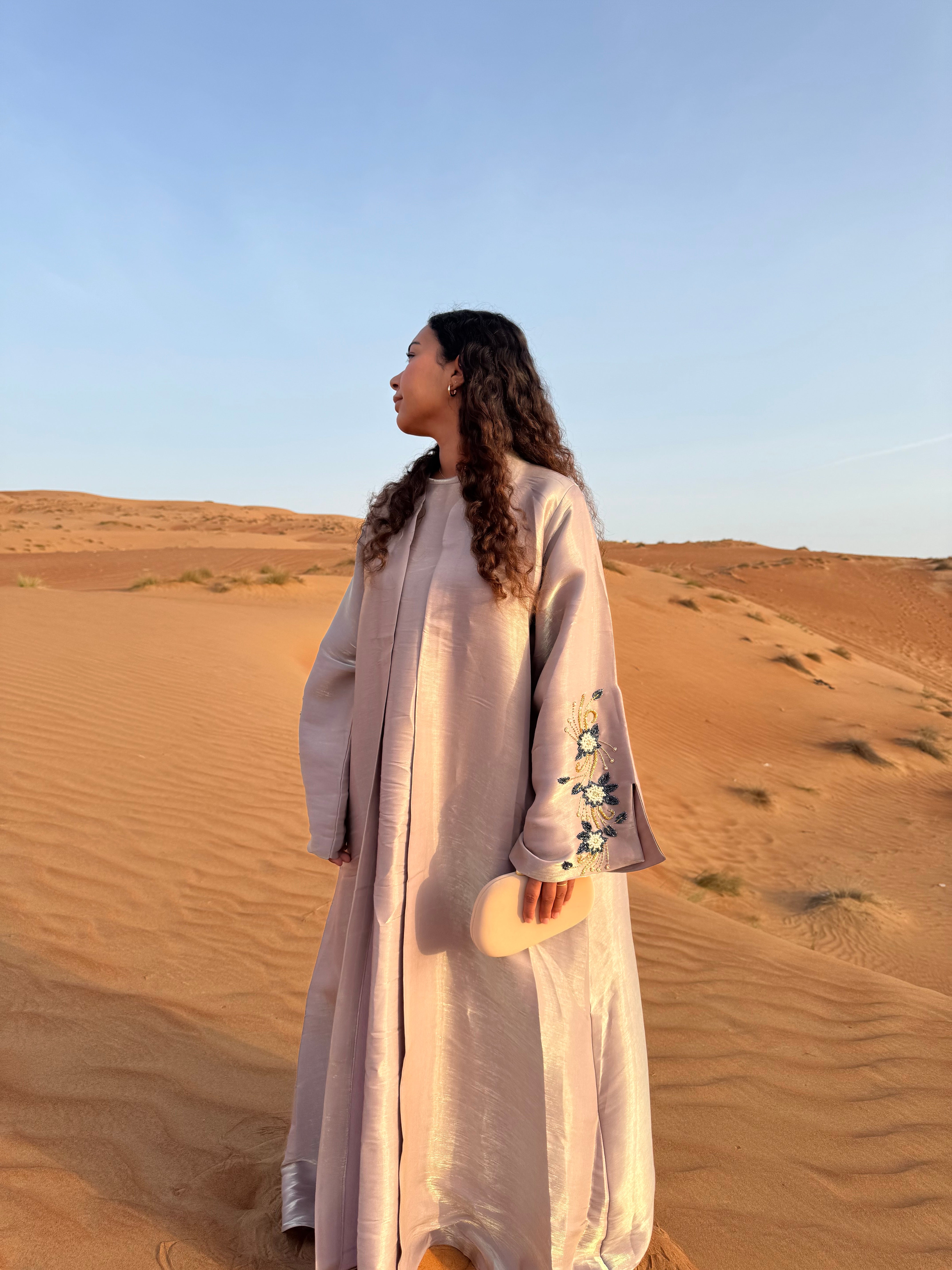 Soyeuse et scintillante, l’abaya Nour est une véritable ode à la lumière. Son tissu shimmer irisé capte chaque rayon et révèle de subtils reflets beiges à chacun de vos mouvements — comme un lever de soleil qui caresse la peau.