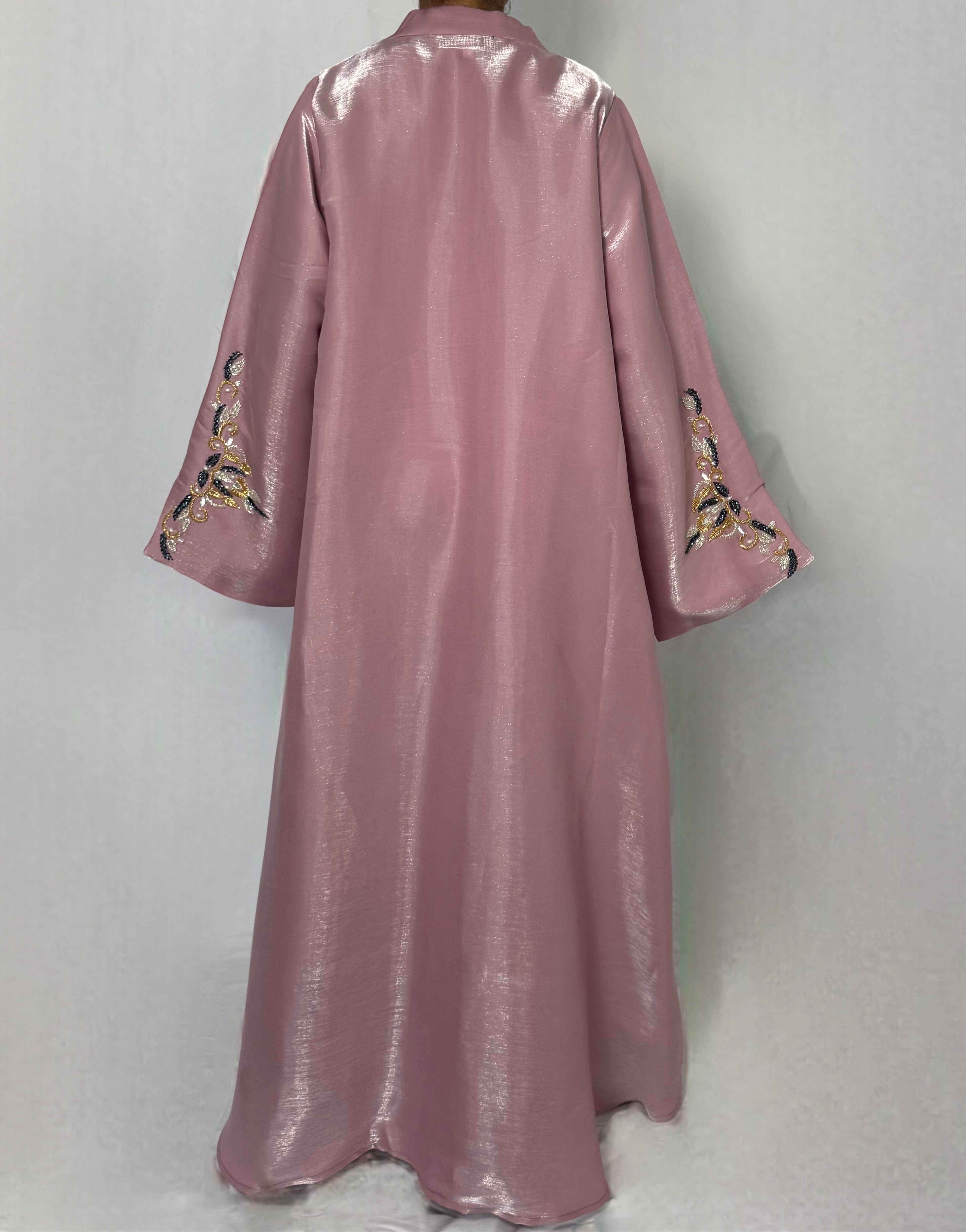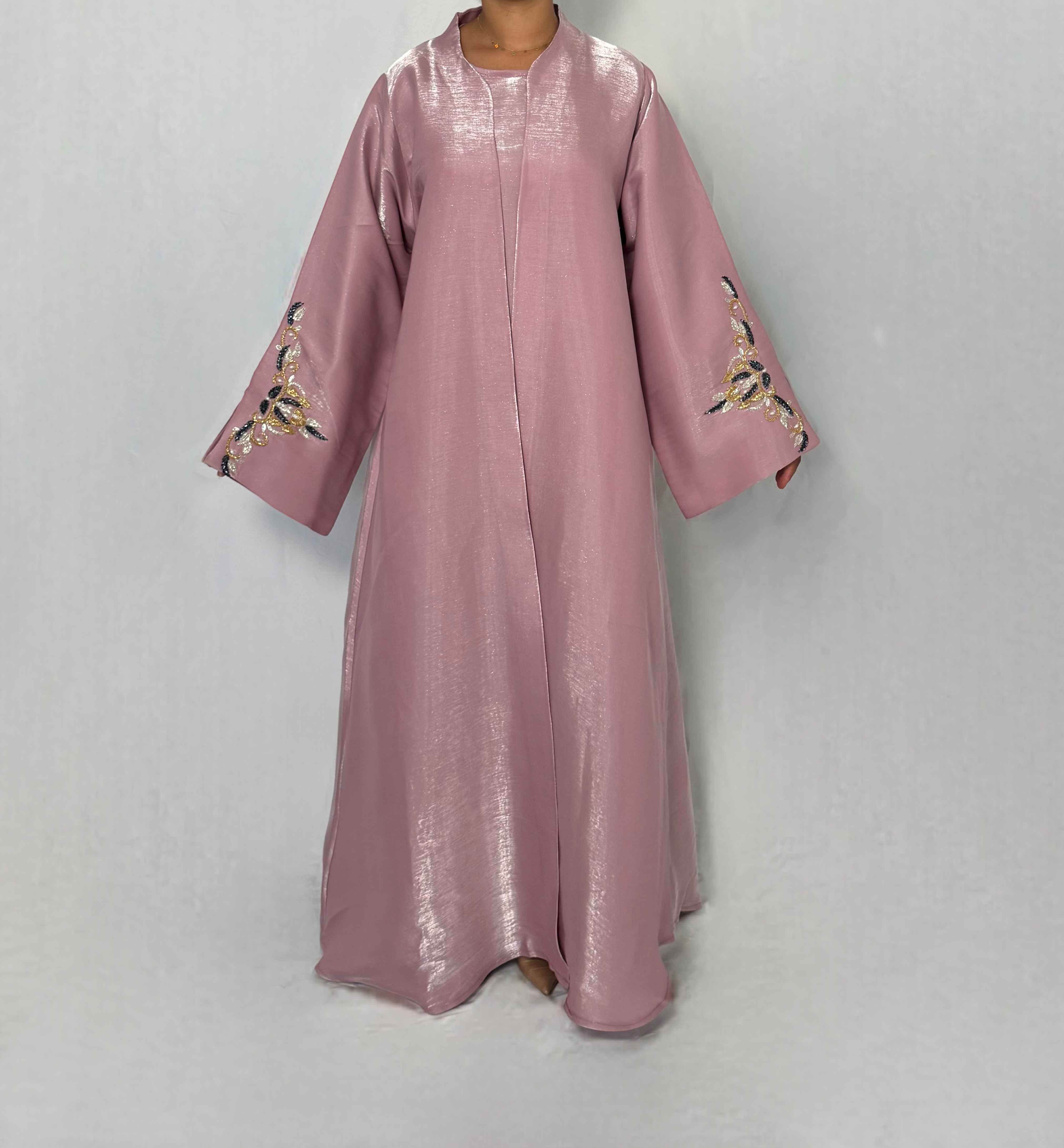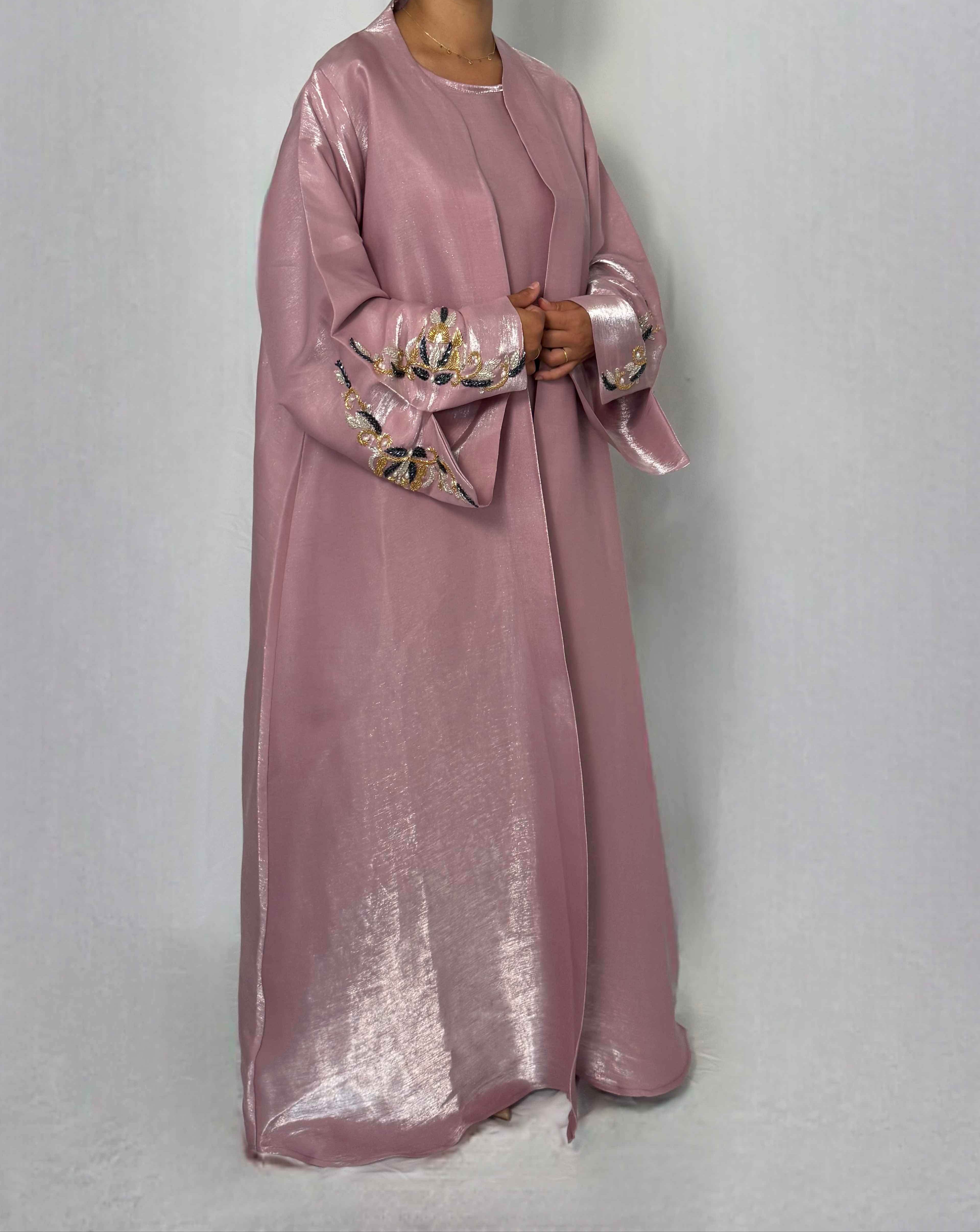 Soyeuse et scintillante, l’abaya Sabah capte chaque rayon et révèle de subtils reflets rosés à chacun de vos mouvements — comme un lever de soleil qui caresse la peau. Façonnée dans un tissu shimmer irisé, elle conjugue éclat et raffinement dans une pièce d’exception.
