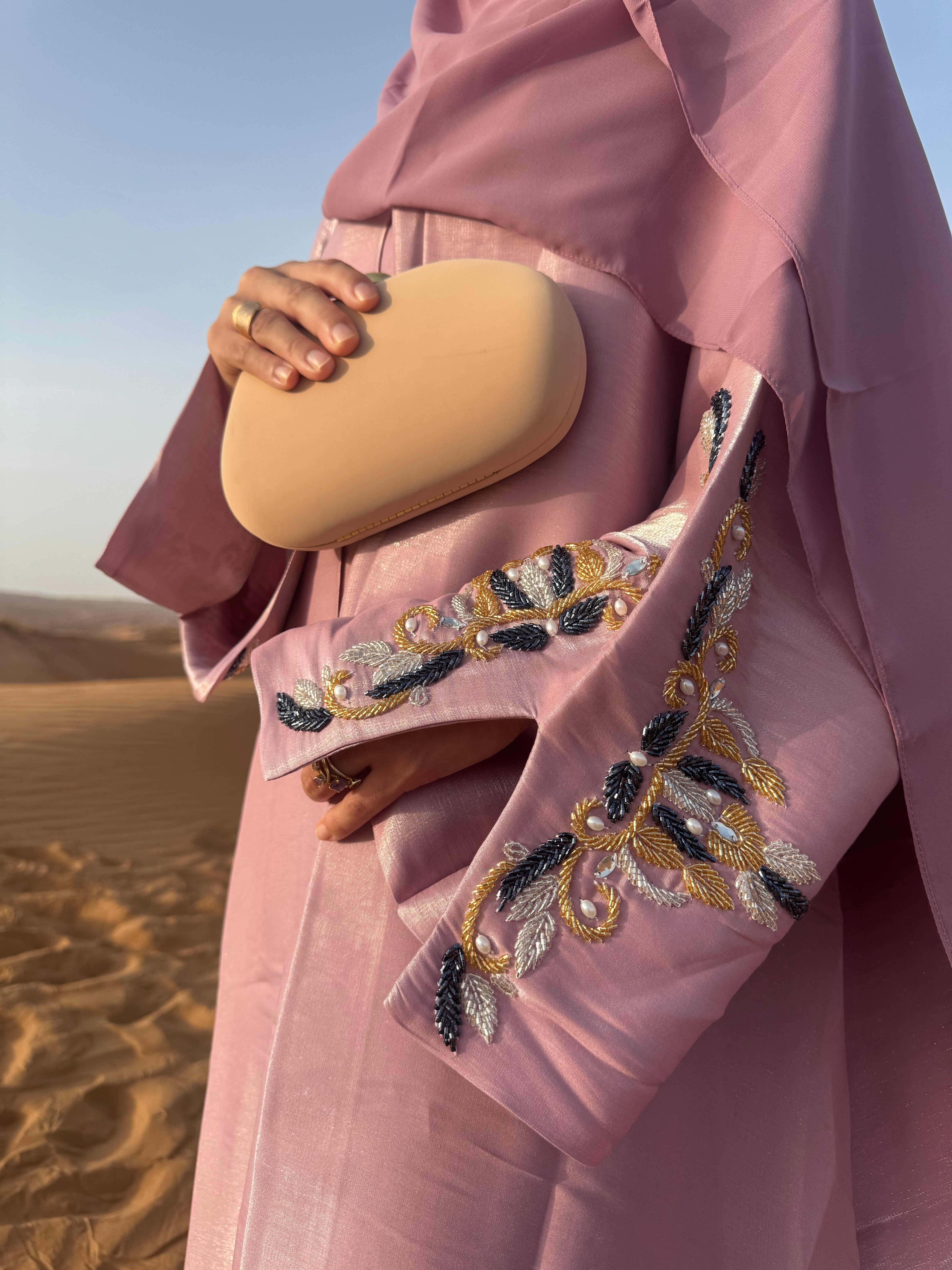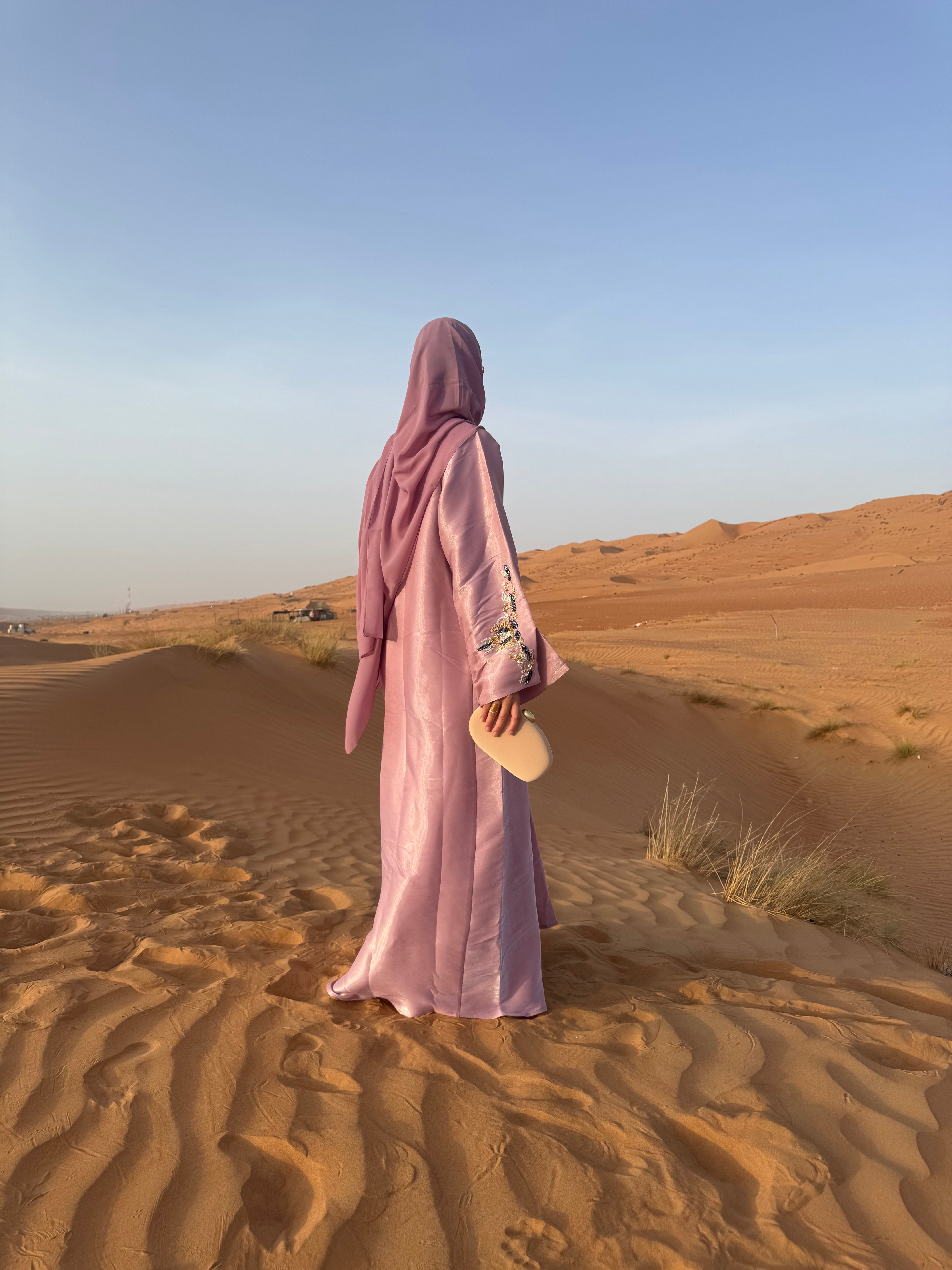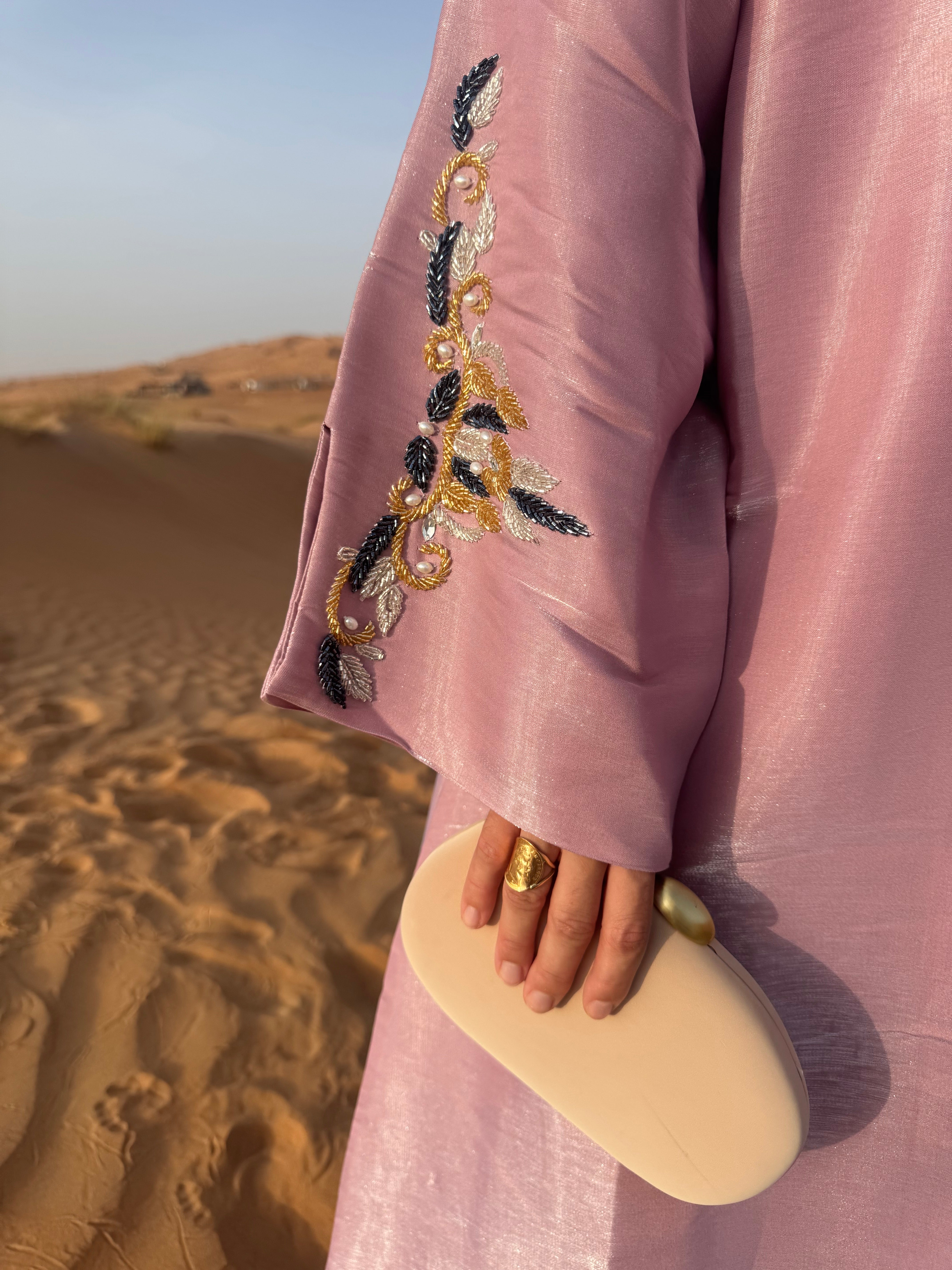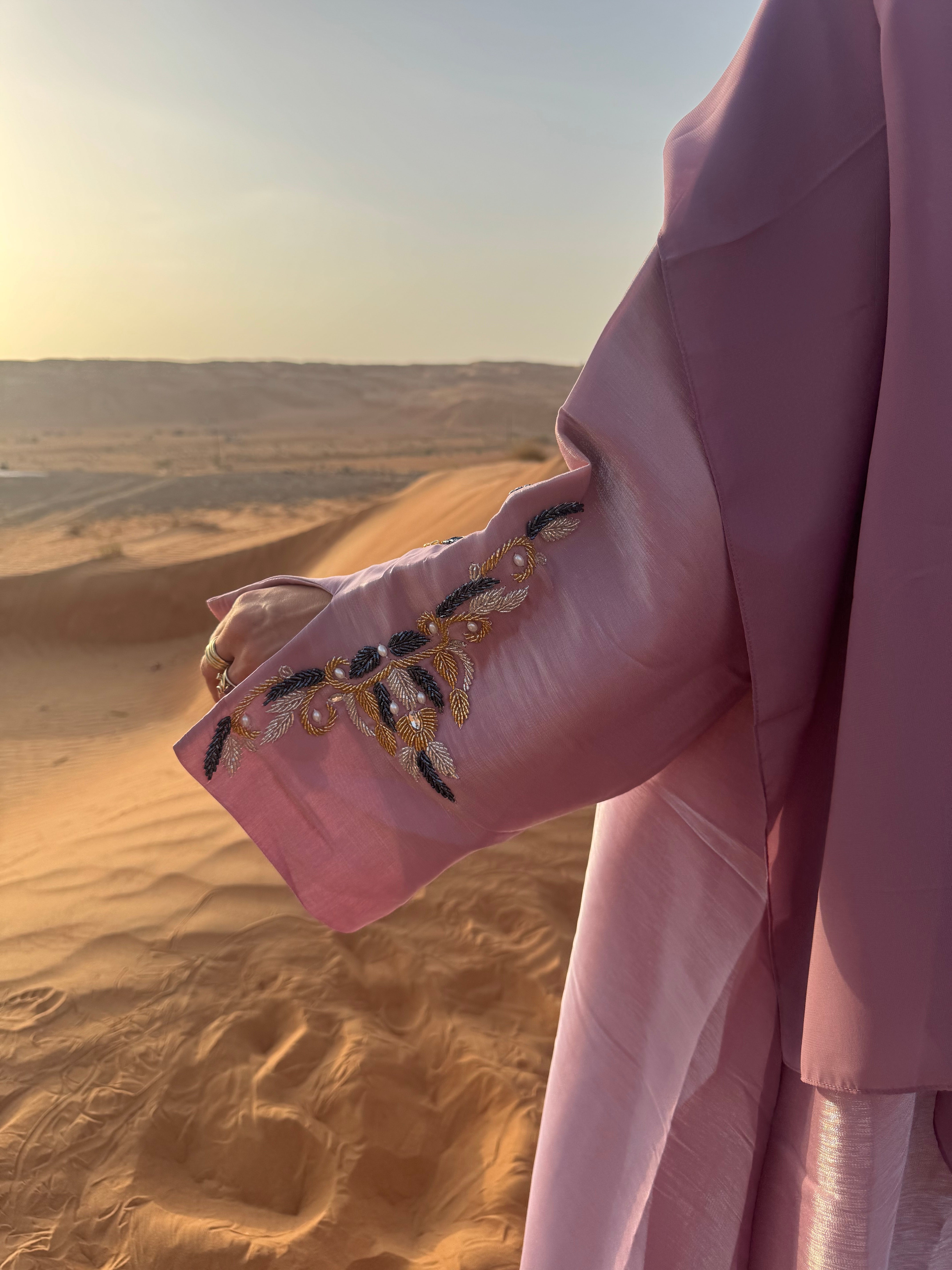 Soyeuse et scintillante, l’abaya Sabah capte chaque rayon et révèle de subtils reflets rosés à chacun de vos mouvements — comme un lever de soleil qui caresse la peau. Façonnée dans un tissu shimmer irisé, elle conjugue éclat et raffinement dans une pièce d’exception.
